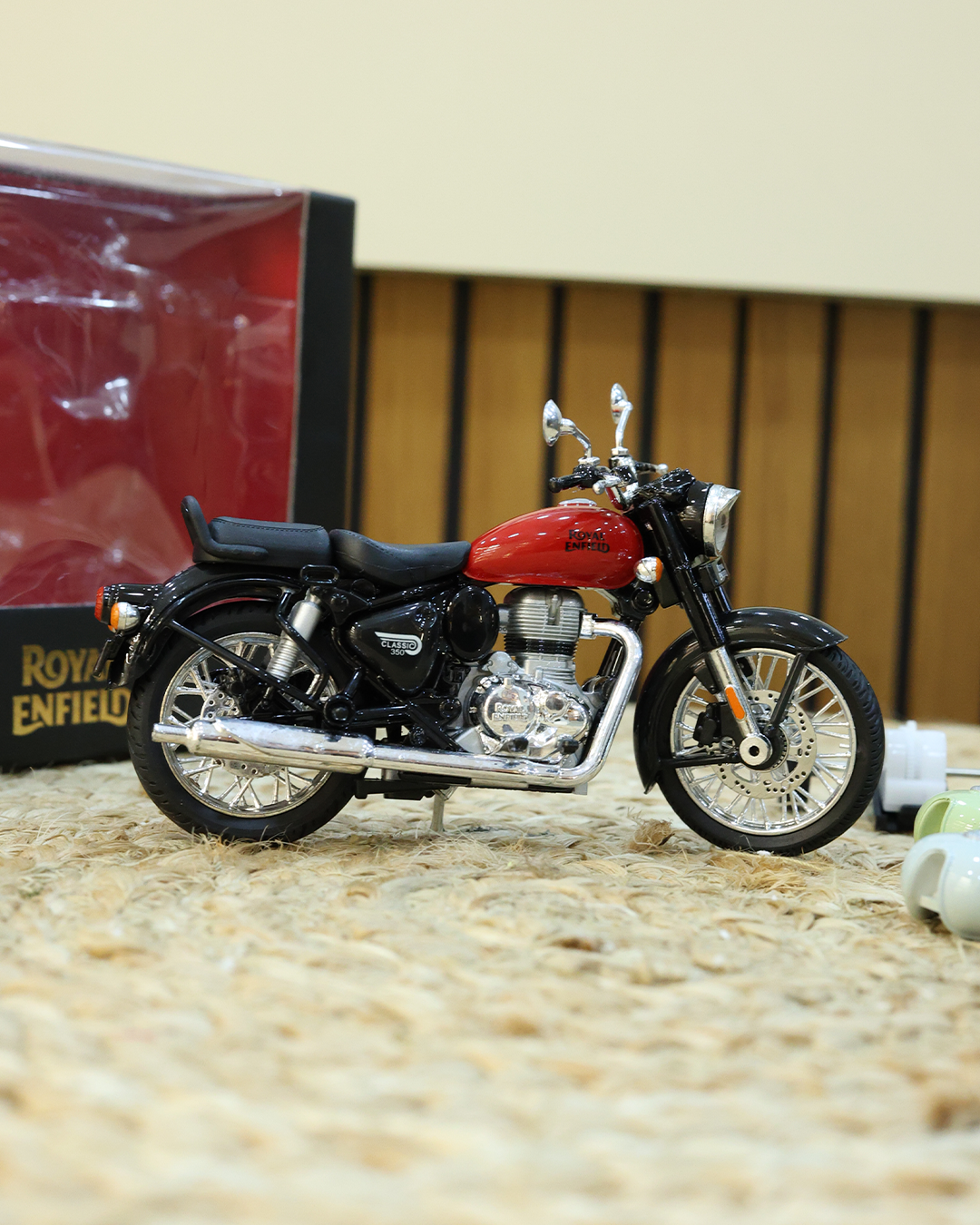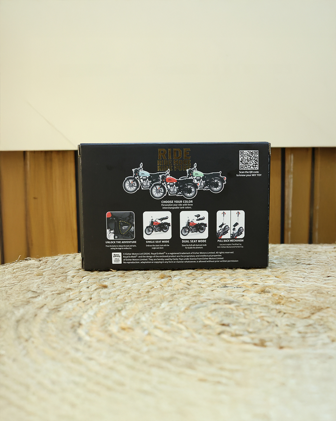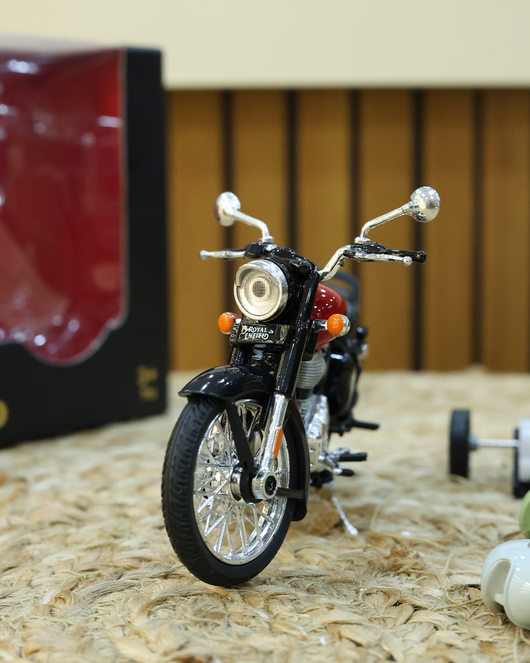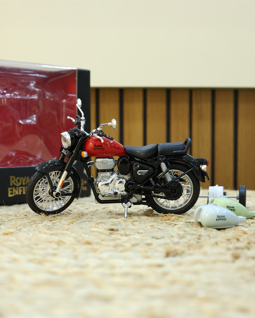 This Centy Royal Enfield Classic 350 toy bike is a finely detailed 1:15 scale licensed model with a pull-back action mechanism. It features realistic design elements and customizable fuel tanks, making it a perfect collectible and gift for kids and bike enthusiasts alike.
