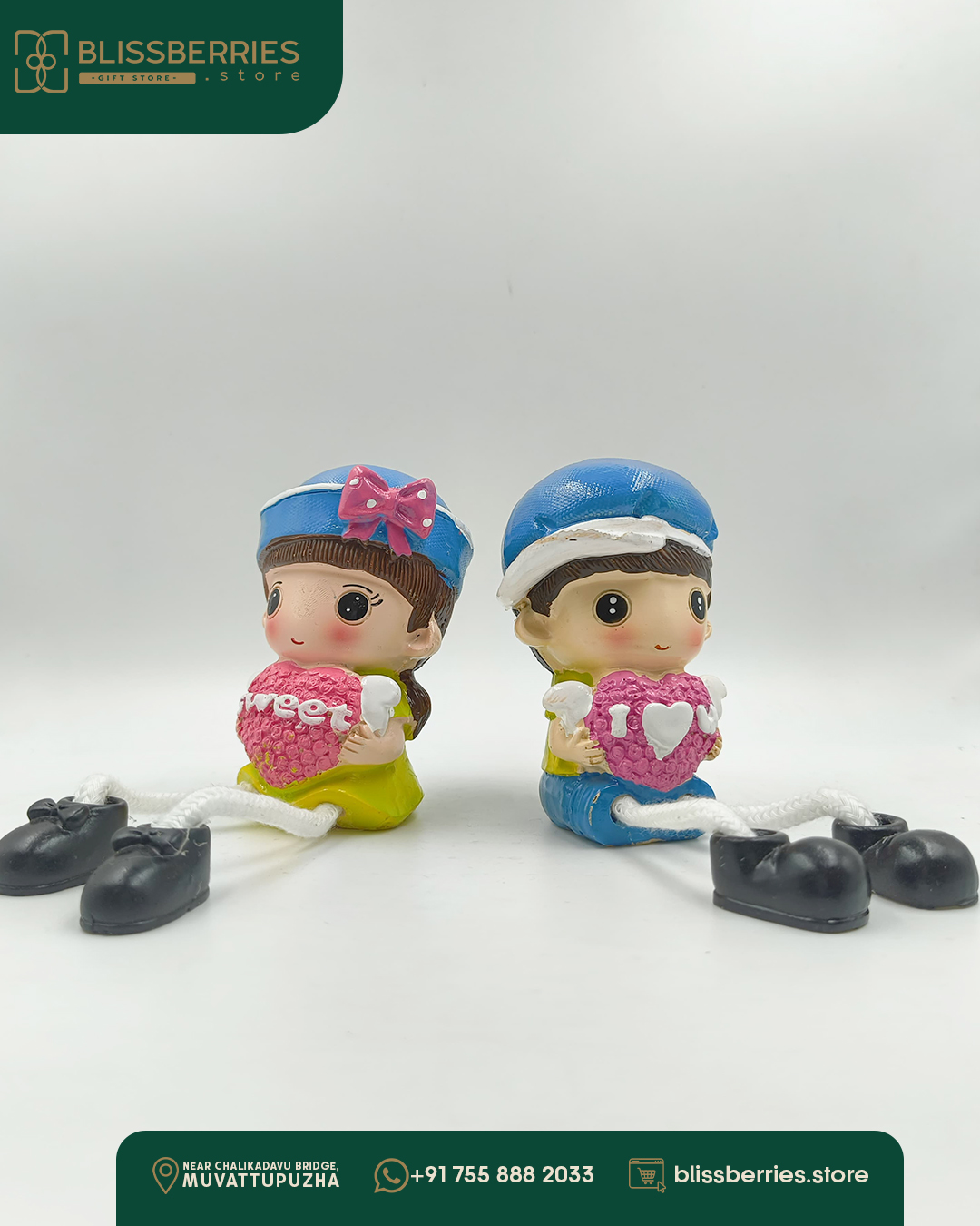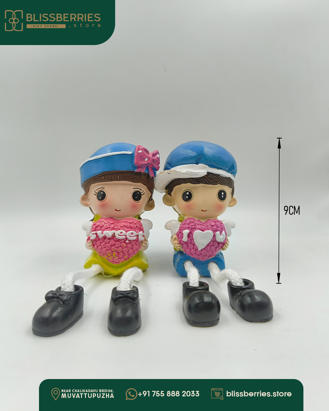 Add a touch of whimsy and romance to your home décor with these adorable couple figurines. Standing 9 centimetres tall, these charming decorative pieces feature two sweet characters wearing blue caps, with one dressed in yellow and the other in blue. Each figurine holds a pink heart-shaped message – one reading ‘sweet’ and the other displaying ‘I ♥ U’. The detailed craftsmanship is evident in their endearing expressions, rosy cheeks, and carefully designed outfits, complete with black shoes and white socks. These delightful ornaments make perfect gifts for Valentine’s Day, anniversaries, or as cute decorative pieces for your shelf, desk, or display cabinet. The figurines capture a moment of innocent romance and can bring a cheerful atmosphere to any space they occupy.