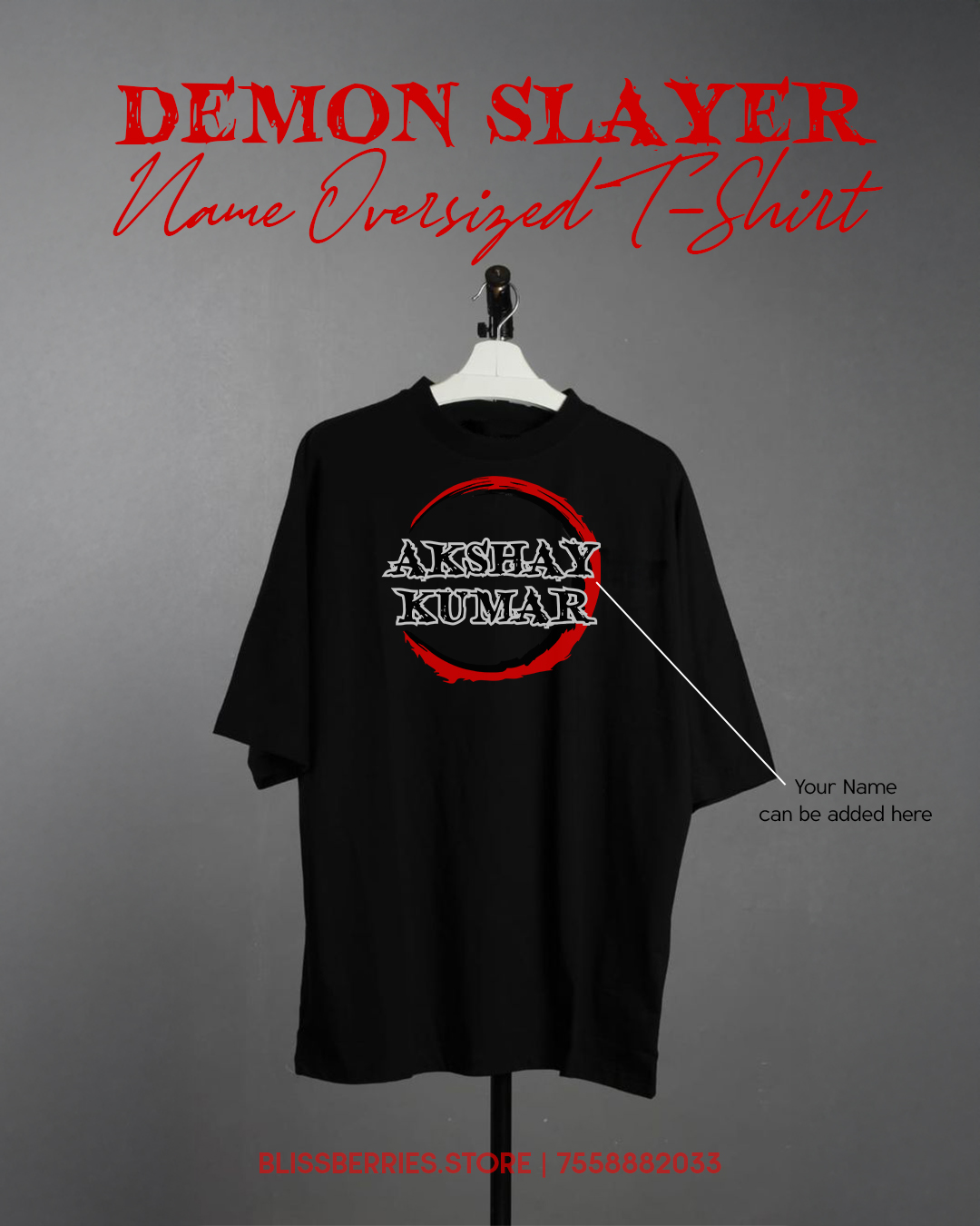 Unleash your inner slayer in oversized comfort. This Demon Slayer-themed oversized t-shirt blends anime aesthetics with personal identity — your name, framed in a fiery red stroke, creates a bold statement for any anime enthusiast.