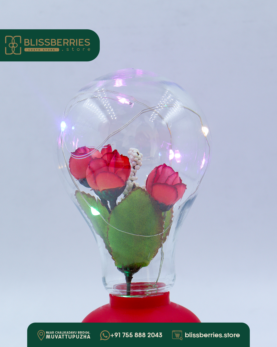 Illuminate your space with the Enchanted Bloom LED Bulb, a beautifully crafted glass bulb featuring vibrant artificial roses and soft LED lights. A perfect decorative piece for romantic settings, bedside tables, or gifting on special occasions.