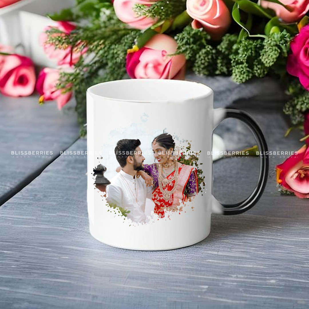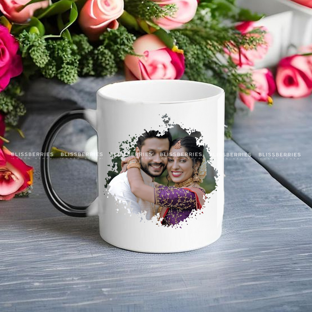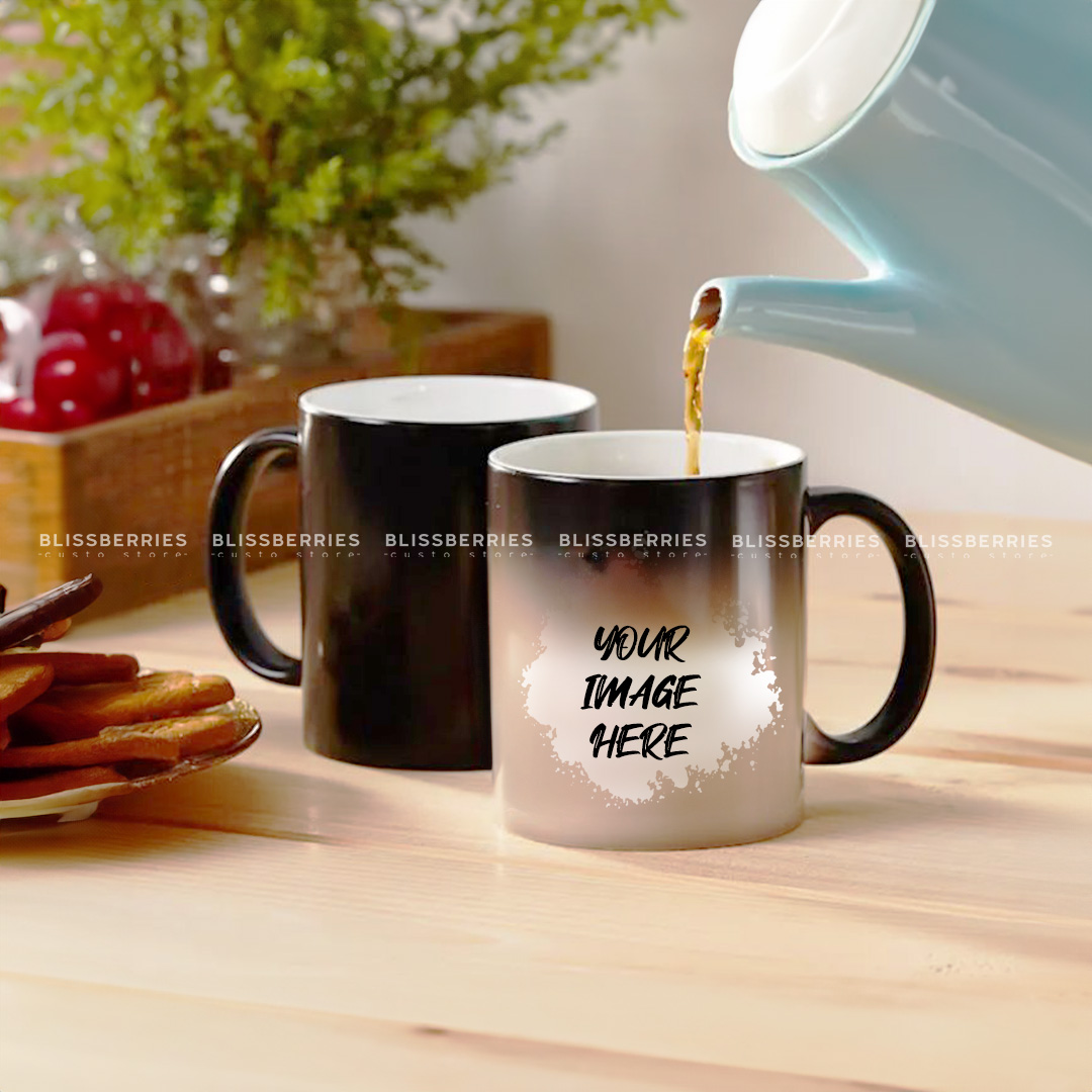 Experience the magic with our Personalized Magic Mug, a sleek black mug that reveals your custom photo when hot liquid is poured in, turning white to display your cherished image. Perfect for adding a touch of surprise to your daily coffee or tea routine, available at Blissberries Custo Store.