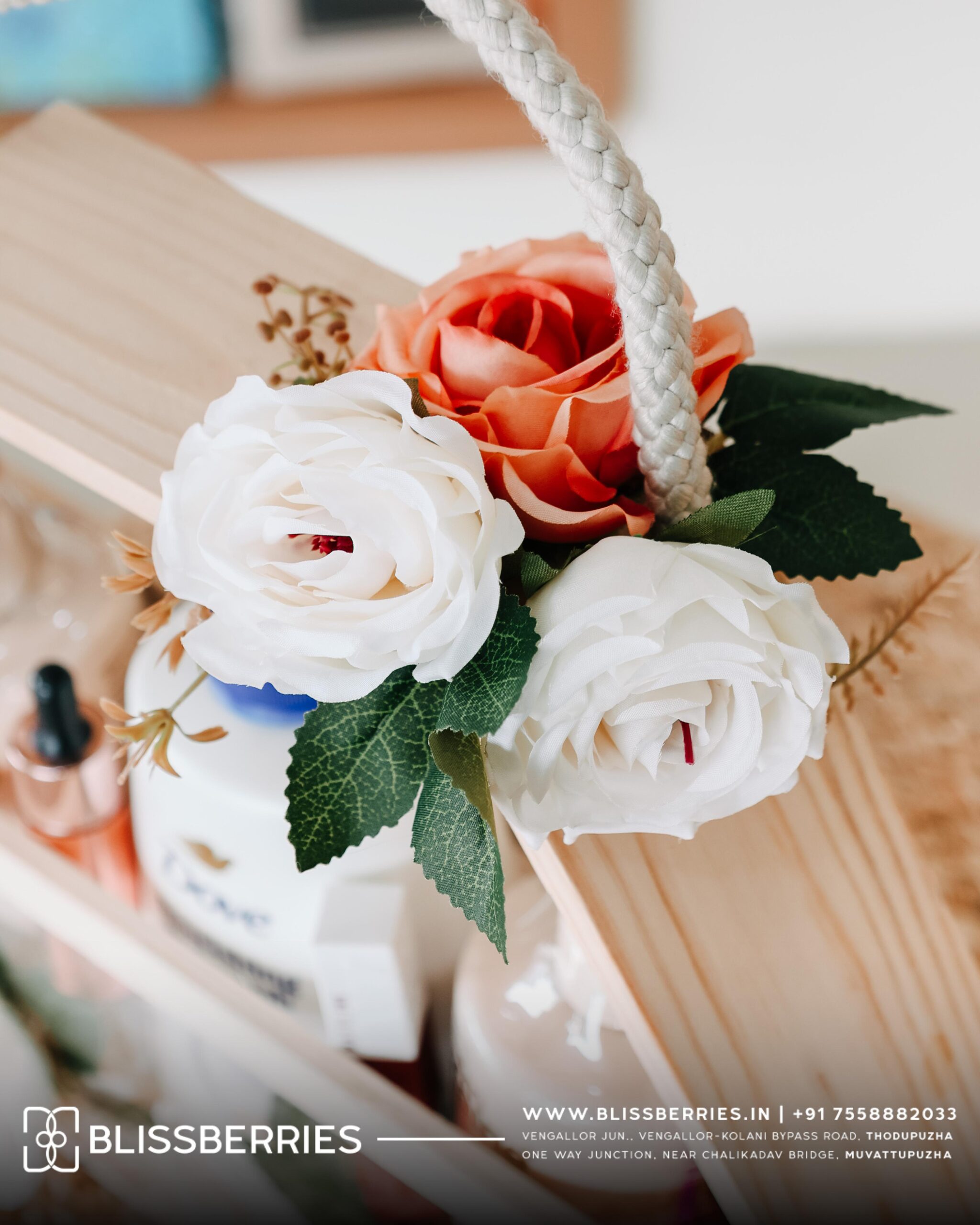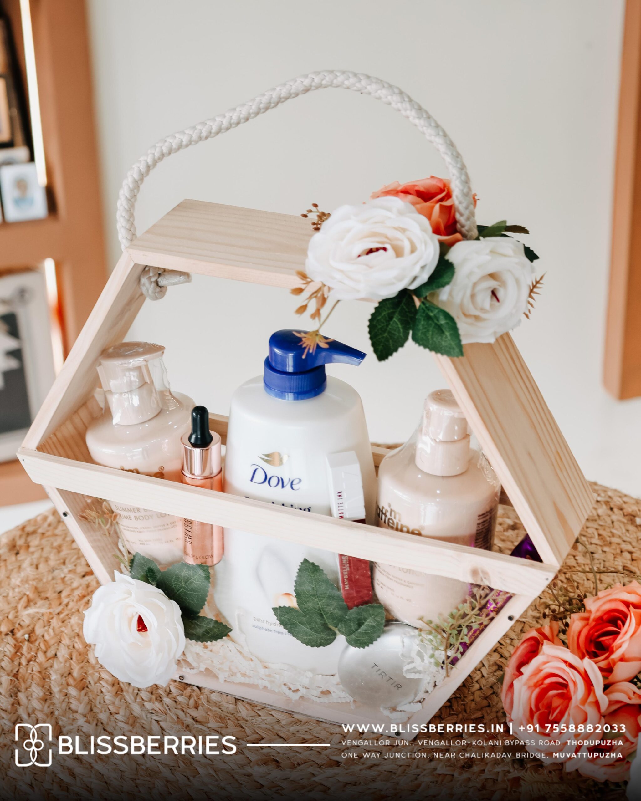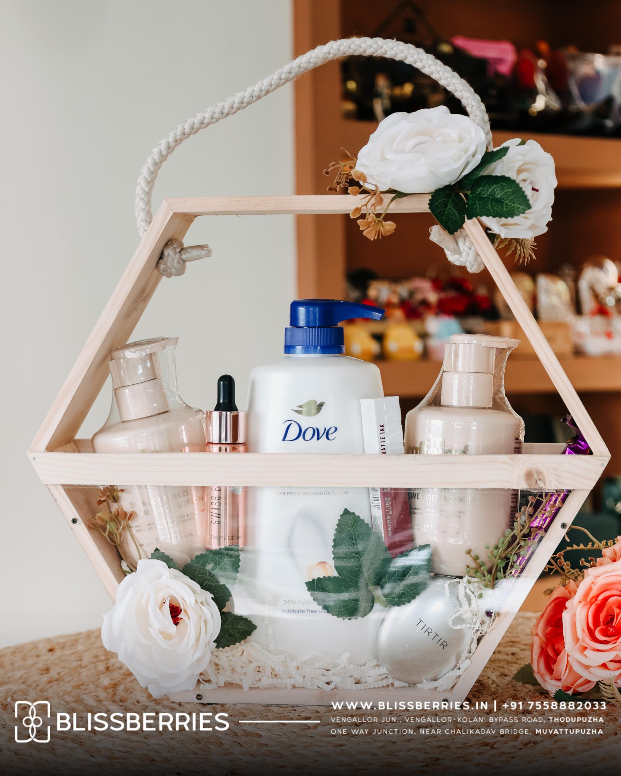 Beautifully arranged in a wooden hexagonal hamper basket with a rope handle, the set also includes chocolates for a sweet treat and artificial flowers that add a decorative and romantic touch. This premium hamper is perfect for creating a thoughtful and memorable gifting experience.
