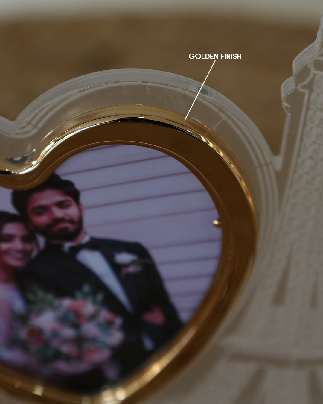 Capture your cherished moments in Parisian style with this enchanting LED photo frame. The elegant design features two heart-shaped frames beautifully arranged around an intricately detailed Eiffel Tower silhouette, creating a romantic centrepiece for any space. The acrylic display stand provides a modern, sophisticated look while the built-in LED lighting adds a warm, magical glow that highlights your precious photographs. Perfect for displaying wedding photos, anniversary memories, or romantic snapshots, this frame makes a thoughtful gift for couples, newlyweds, or anyone who appreciates the romance of Paris. The durable acrylic construction ensures your memories are showcased beautifully, while the gold-trimmed heart frames add a touch of luxury. This illuminated photo frame serves as both a practical display piece and an artistic decoration that brings the magic of the City of Love into your home.