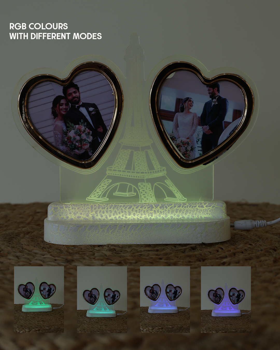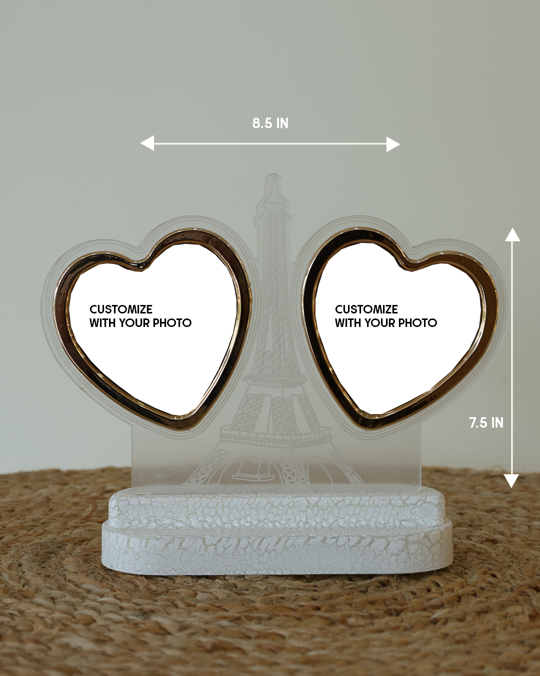 Romantic Eiffel Tower Double Heart Photo Frame with LED Light, Acrylic Display Stand