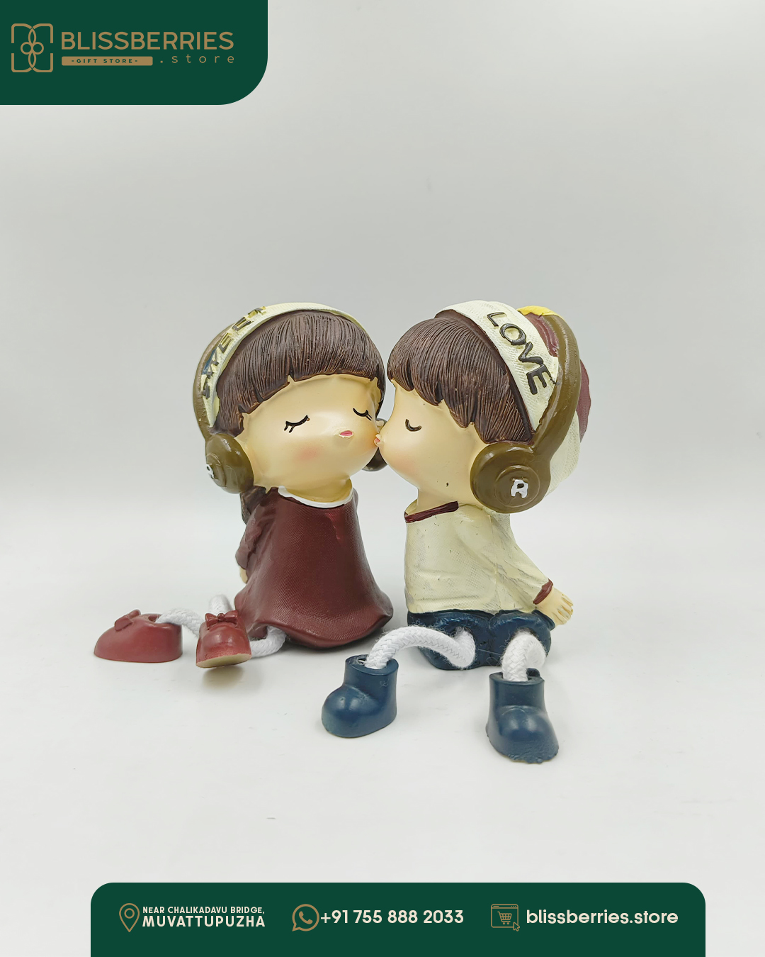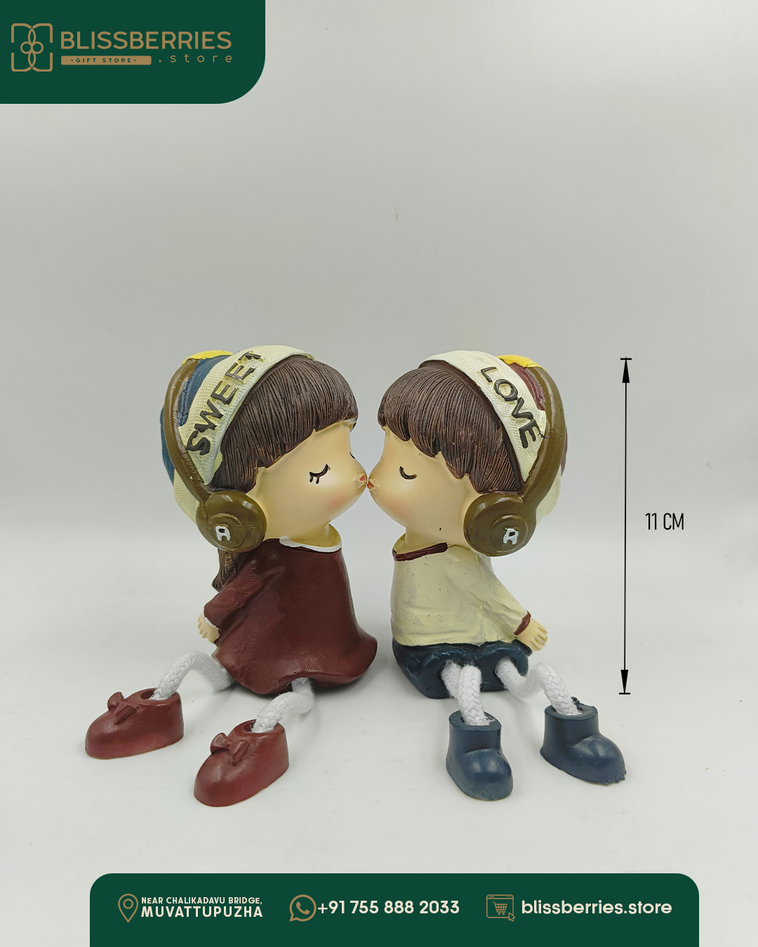 Add a touch of whimsy and romance to your home décor with this charming couple figurine set. Standing 11 centimetres tall, these adorable figures showcase a sweet moment between two music lovers wearing vintage-style headphones. The detailed craftsmanship is evident in their endearing expressions, brown hair, and carefully painted attire – one in a brown dress and the other in a beige top with blue trousers. Each figurine features ‘SWEET’ and ‘LOVE’ text on their headphones, making them perfect as decorative pieces for shelves, desks, or display cabinets. Their dangling legs with contrasting shoes add a playful touch to the overall design. This decorative piece makes for a thoughtful gift for music enthusiasts or couples who share a love for melody and romance.