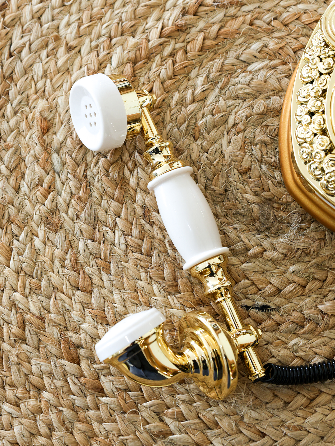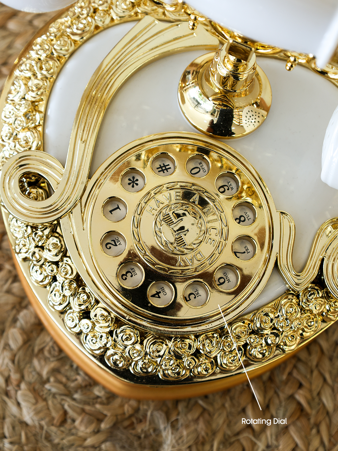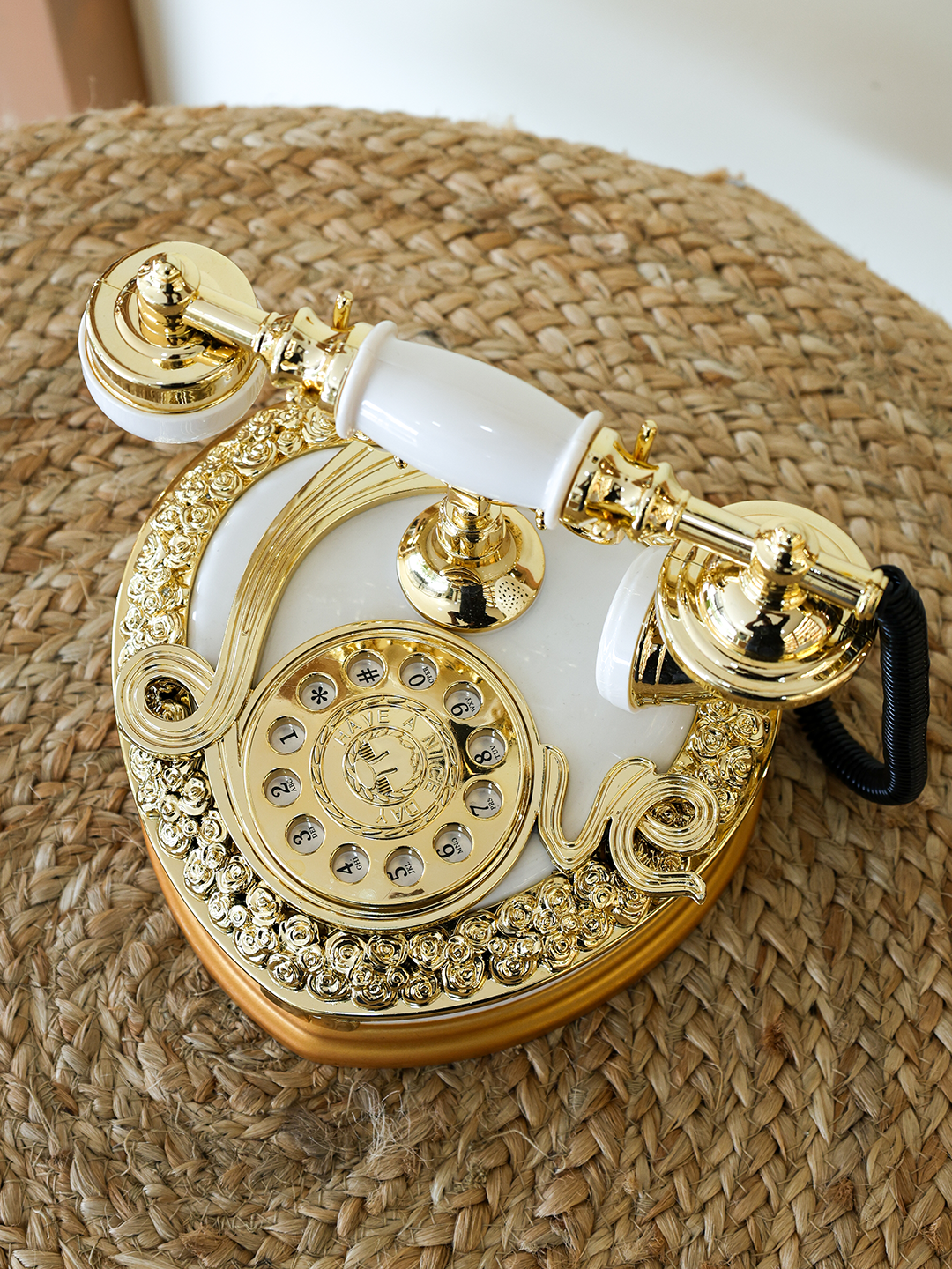 A statement vintage-style telephone in elegant white and gold with ornate detailing and a discreet storage compartment for jewelry, keys, or keepsakes; perfect for living rooms, offices, weddings, and photography props while following title-length best practices for strong SEO visibility.